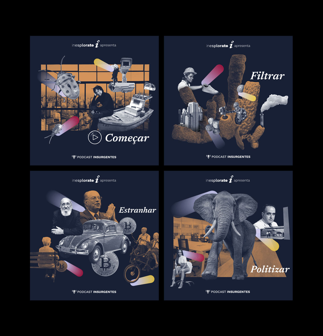 ︎︎︎ The Insurgentes podcast project, created for Inesplorato, was built around the brand’s existing visual identity, meaning the color palette and typography had to be maintained. It was important to have design work that stayed true to the brand’s look while creating fresh logo and artwork for the podcast. Drawing inspiration from the word "Insurgente," meaning rebellion and movement, the design aimed to capture that sense of defiance. The concept focused on separating and connecting the letters in “Insurgentes” in ways that represented constant motion. Since the podcast covers topics like politics, communication, insurgency, and entrepreneurship, documentary-style collages were used to reflect these themes, drawing listeners in. Additional graphics and visuals were created to support and promote the podcast while aligning with the new design direction.